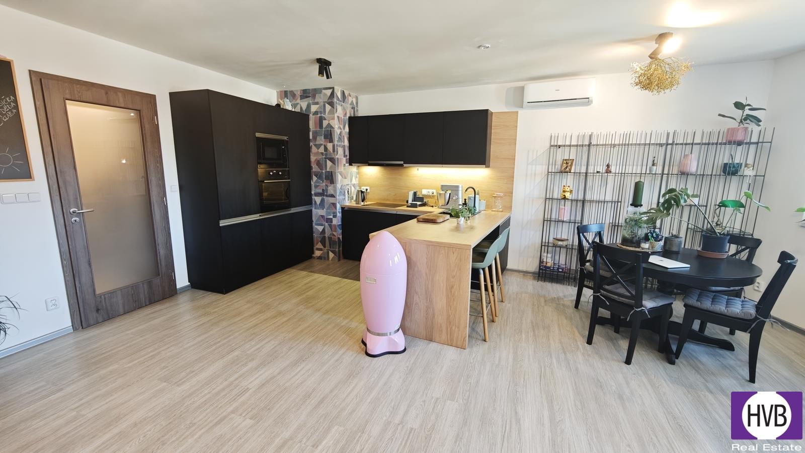 Dispozice bytu nabízí v nižším podlaží chodbu, první z koupelen a prostorný obývací pokoj s plně vybaveným, moderním kuchyňským koutem. Z obývacího pokoje vedou designové schody do druhého patra bytu, kde se nachází chodba s prostorem pro vytvoření pracovního nebo cvičebního koutu, ložnice s velkou vestavěnou skříní se zrcadlem a druhá koupelna se sprchovým koutem, WC, pračkou, sušičkou a plynovým kondenzačním kotlem.