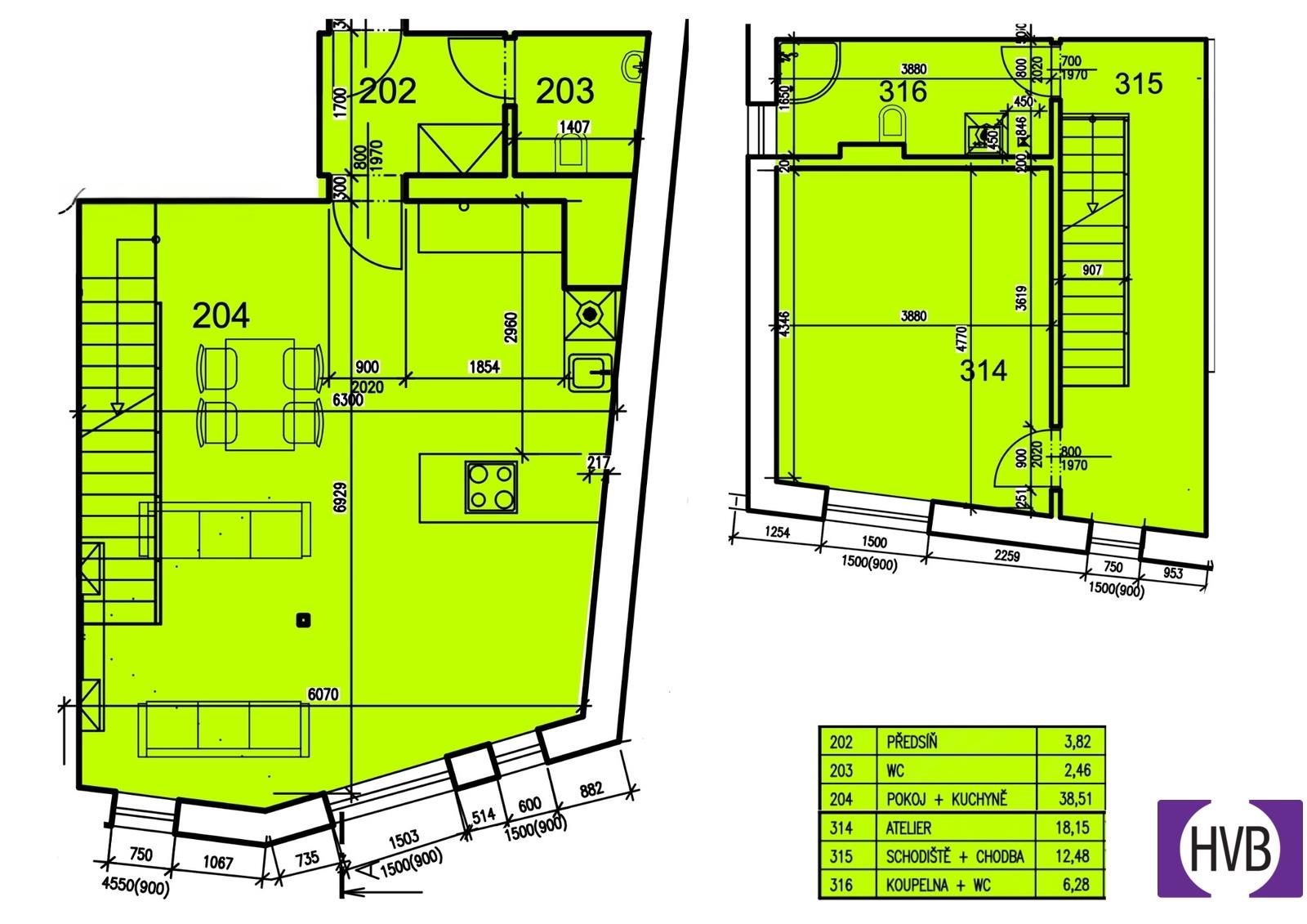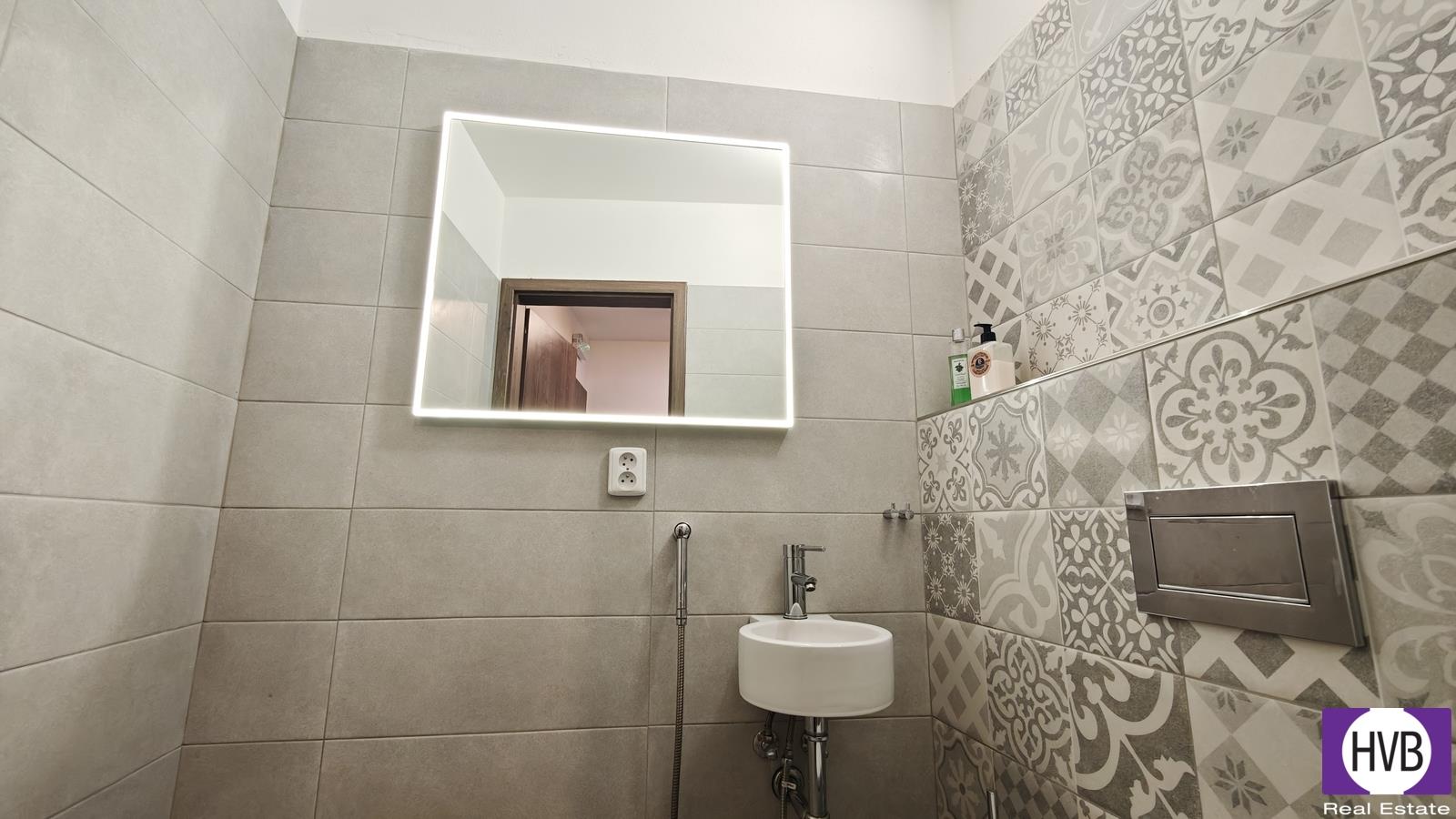 Dispozice bytu nabízí v nižším podlaží chodbu, první z koupelen a prostorný obývací pokoj s plně vybaveným, moderním kuchyňským koutem. Z obývacího pokoje vedou designové schody do druhého patra bytu, kde se nachází chodba s prostorem pro vytvoření pracovního nebo cvičebního koutu, ložnice s velkou vestavěnou skříní se zrcadlem a druhá koupelna se sprchovým koutem, WC, pračkou, sušičkou a plynovým kondenzačním kotlem.